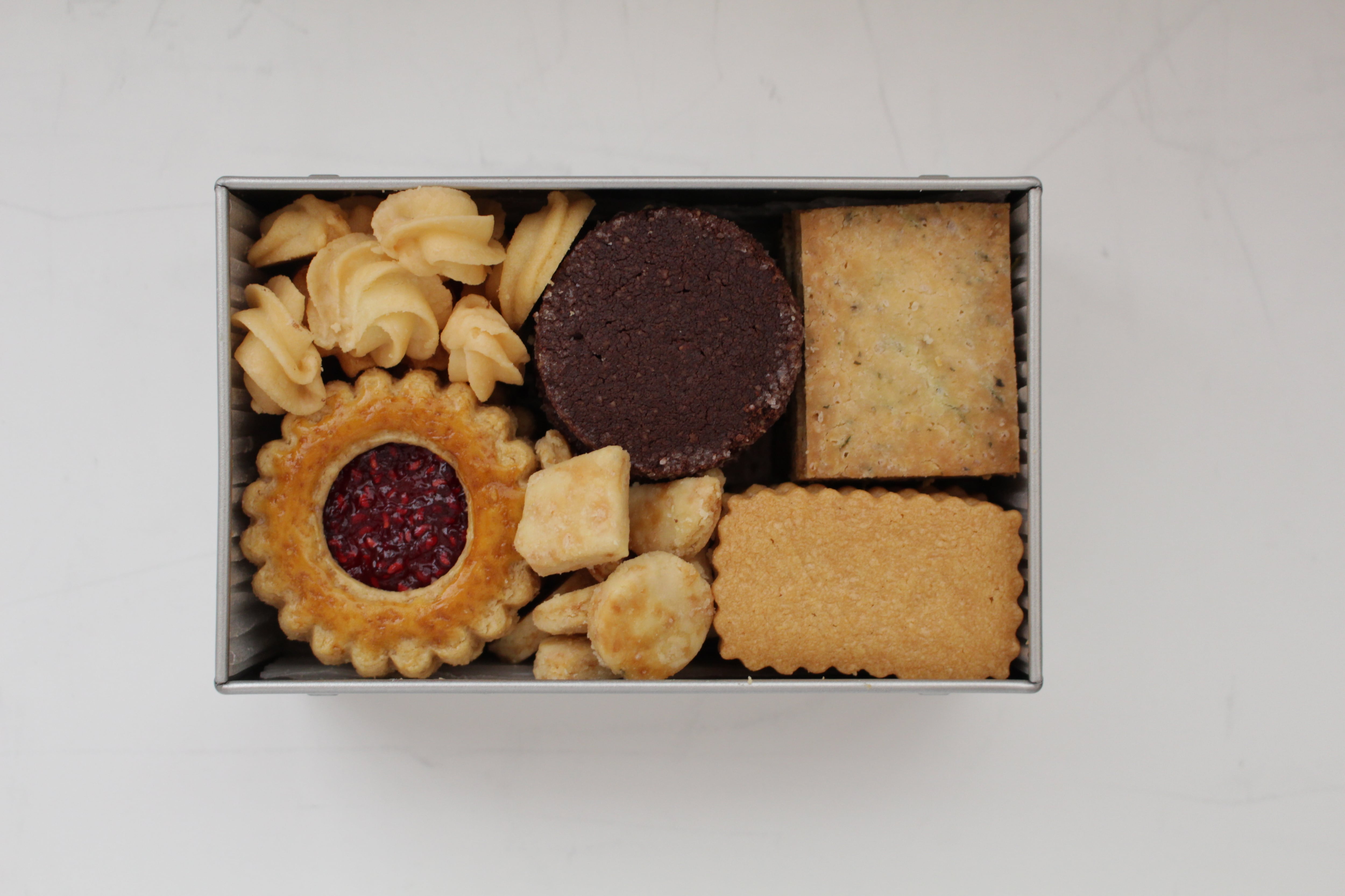 小麦粉、バター、砂糖、米粉、米油、アーモンド、フランボワーズ、ココア、牛乳、卵、カカオニブ、ローズマリー、塩
